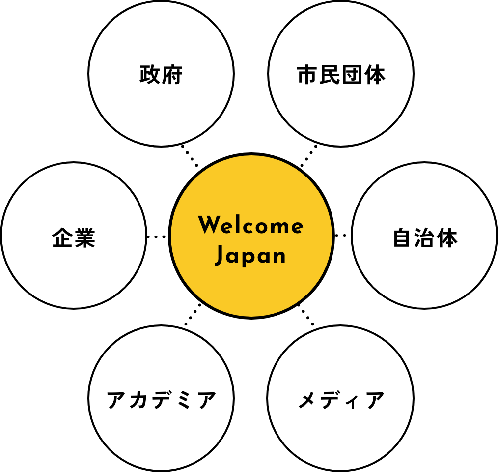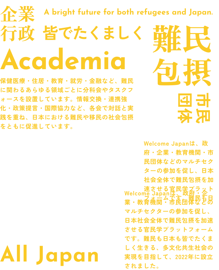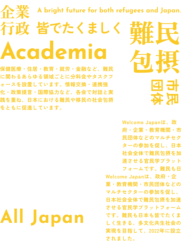Welcome Japanは、政府・企業・教育機関・市民団体などのマルチセクターの参加を促し、日本社会全体で難民包摂を加速させる官民学プラットフォームです。難民も日本も皆でたくましく生きる、多文化共生社会の実現を目指して、2022年に設立されました。